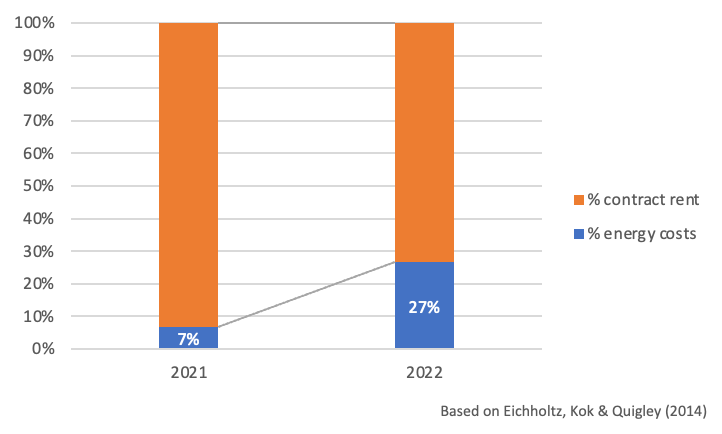 During the past decade, the real estate sector has witnessed an increased interest in energy efficiency, mostly to reduce carbon emissions. However, energy expenditures in offices, warehouses, shops, and other commercial buildings are often just a relatively small portion of total occupancy cost for a tenant. How small? That depends on the headline rent (and thus the location of the building), the type of building, and the intensity of use, but research shows that, on average, energy costs are about 7% of occupancy costs. That’s a simple, plain average for office buildings, and the percentage will be likely be lower in high-rent locations such as London City, Amsterdam’s Zuidas, or downtown Paris. But of course, energy costs relative to rent might be (much) higher for energy-intensive tenants in low-cost locations. Taking 7% as a starting point and applying the lower-end increase in energy prices, at 5x last year’s prices, that would lead energy costs to be more than a quarter of total occupancy costs. At that point, energy costs would certainly be material.