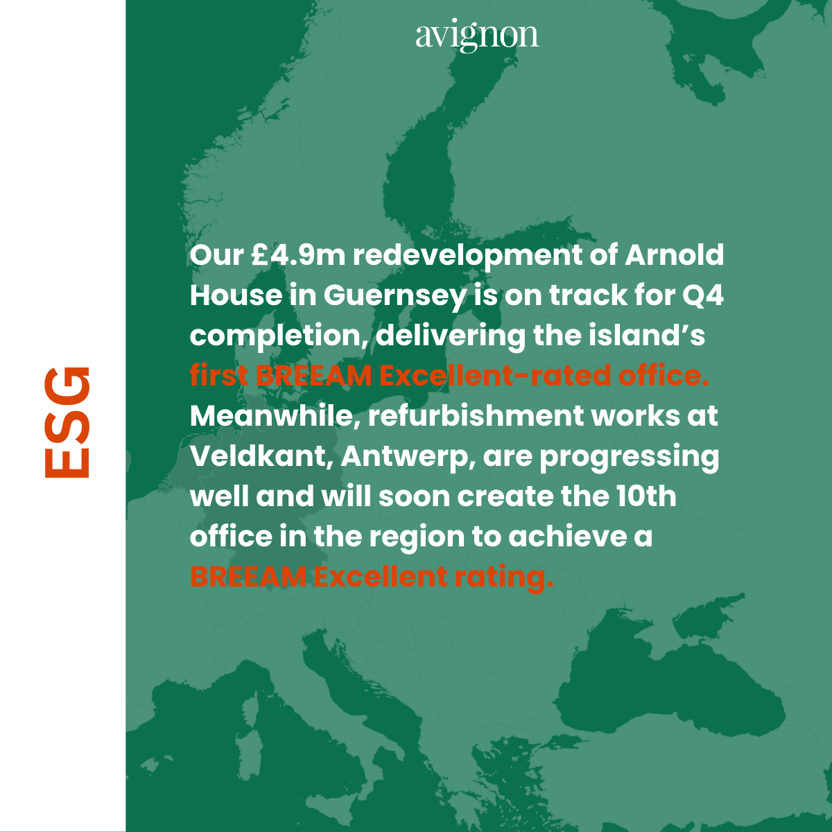 Our £4.9m redevelopment of Arnold House in Guernsey remains on track for Q4 completion, delivering the island’s first BREEAM Excellent-rated office. Meanwhile, refurbishment works at Veldkant, Antwerp, are progressing well and will soon create the 10th BREEAM Excellent-rated office in the region. We also achieved EPC improvements across our UK retail portfolio, with two assets upgraded from B to A, reinforcing our commitment to energy efficiency and sustainability.